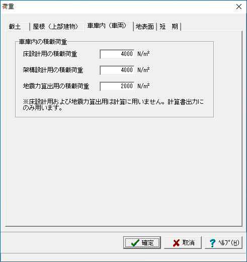 なお、「屋根の積載荷重」の『架構設計用』は長期時、短期時の計算に用いており、『地震力算出用』は短期時地下部の地震力(慣性力)の算出にのみ用います。『床設計用』は計算書の出力用にのみ参照しており計算には用いておりません。