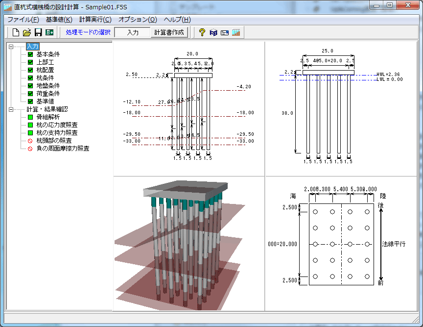 港湾基準及び漁港・漁場基準を参考に、主に桟橋の性能照査(杭の応力に関する照査、杭の支持力に関する照査)の解析をサポートします。