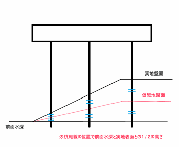 実地盤面から各杭位置において1/2高さの位置を仮想地表面と定義し、それ以深の部材に対して各荷重ケースに応じた地盤バネでモデル化します。