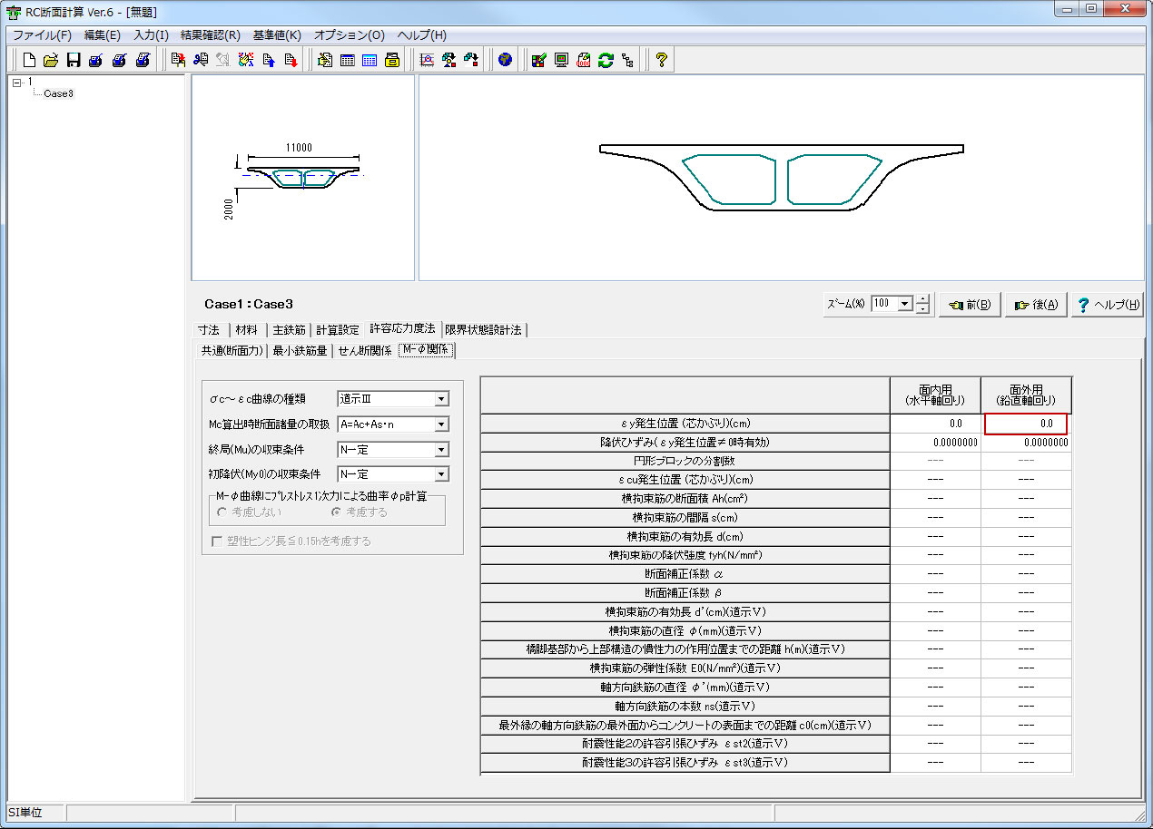 上記の説明のように、もし、ウェブの鉄筋位置にεyを発生させたければ、上床版端部(引張縁)からその位置までの距離を「εy発生位置(芯かぶり)」へ入力してください。そして面外結果だけを利用してください。そのときの面内結果は意味がありません。