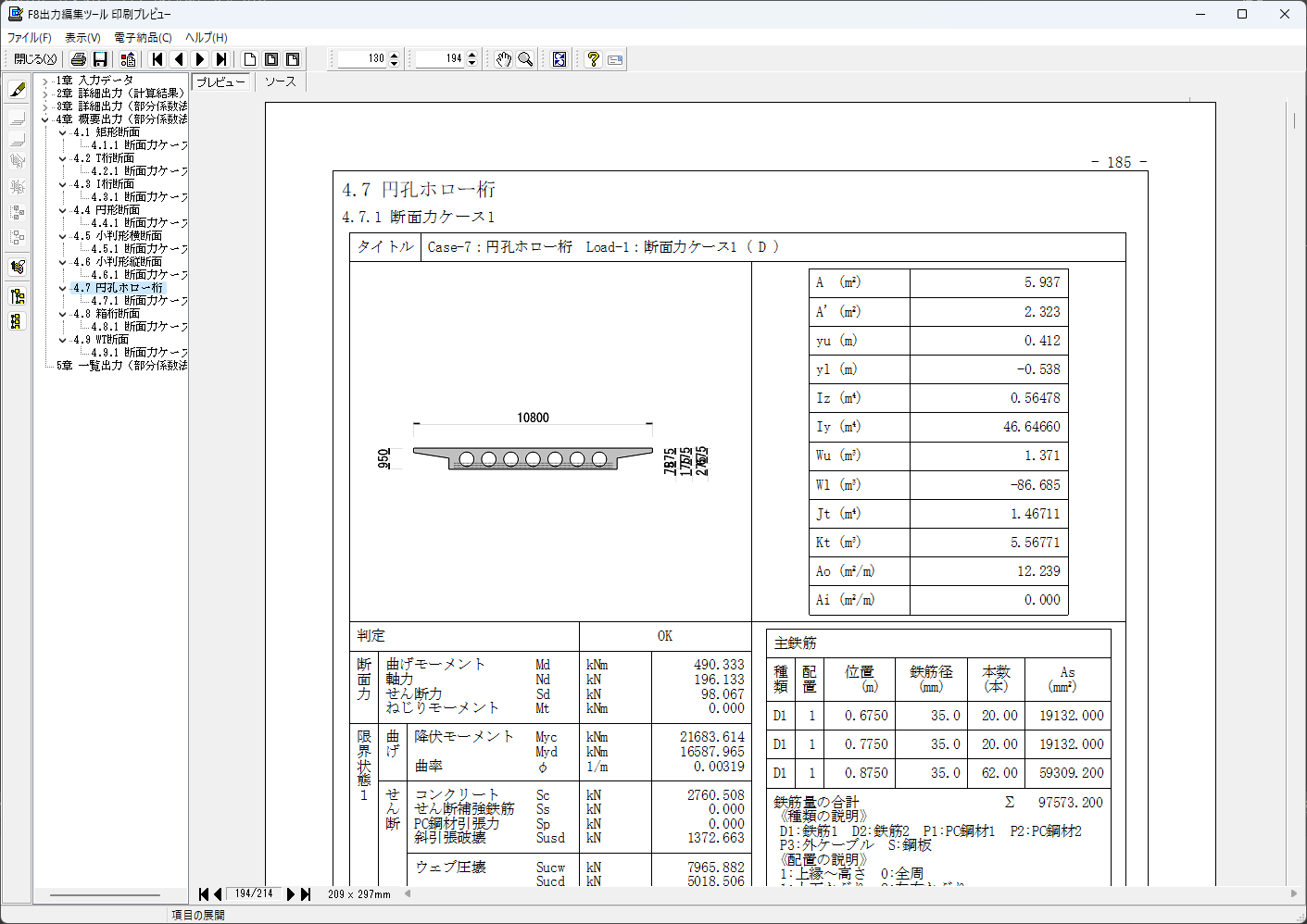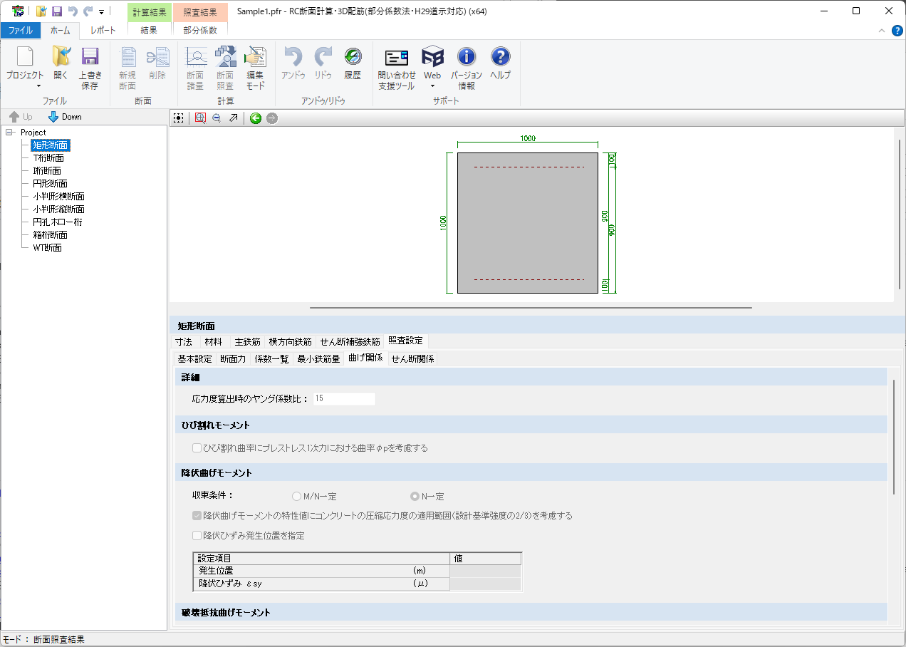 様々な断面形状を持つ鉄筋コンクリート断面の応力度計算、必要鉄筋量、最小鉄筋量、抵抗モーメント、終局モーメント、初降伏モーメントの計算と、限界状態設計法による断面照査を行うプログラムです。 平成29年道路橋示方書に対応し、部分係数法による照査を新たに導入しております。