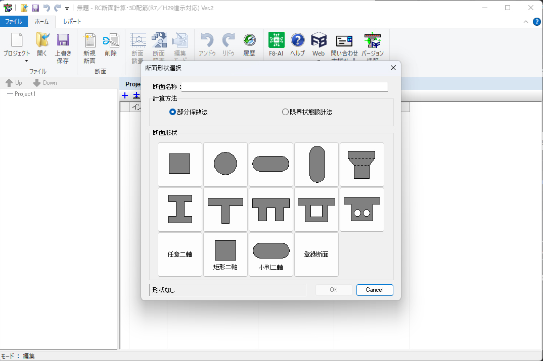 限界状態設計法の照査は、矩形(ハンチなし・中空部なし)、円形・円環、I形、T形、箱形(1室、ハンチなし)に限定され、それ以外の断面形(二軸断面を含む)は現バージョンでは照査できません。