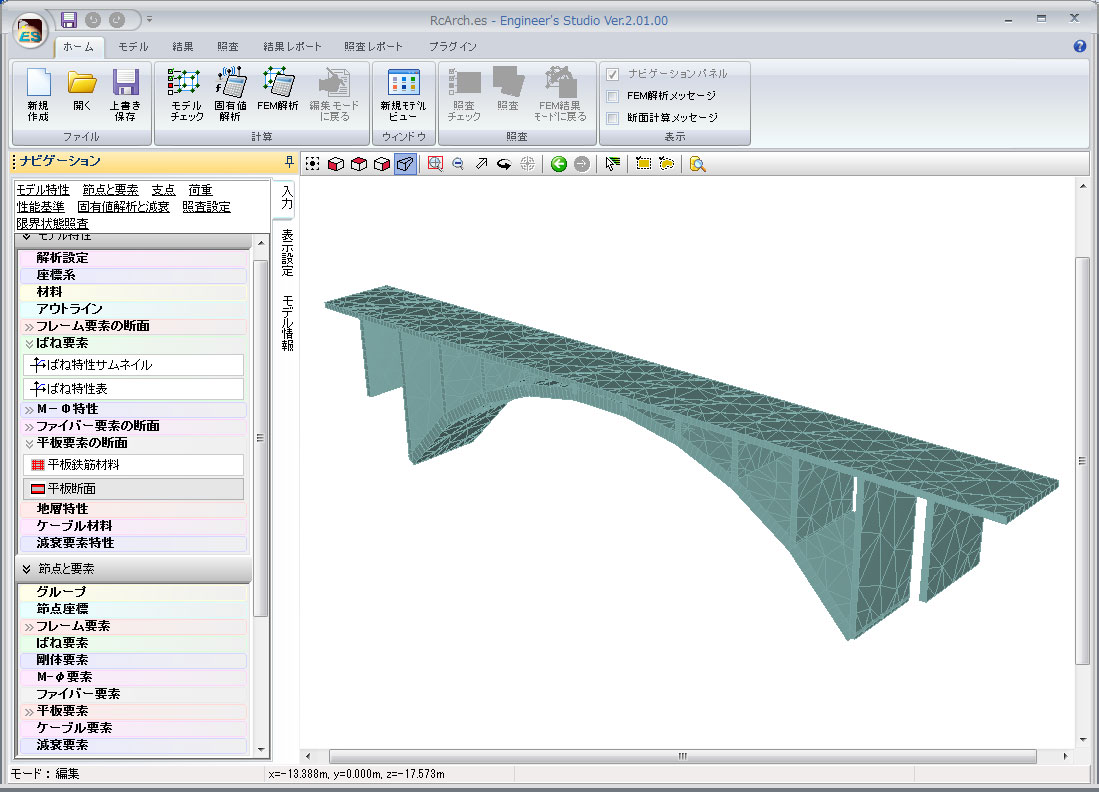 また、板要素を使用したFEMモデルも作成可能で、部材は線形要素から非線形要素まで、荷重も静的荷重から動的荷重まで対応可能となります。