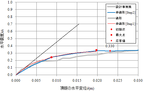 水道施設耐震工法指針・解説2009年版(社団法人日本水道協会)の「池状構造物に対する静的非線形解析」に対応したEngineer's Studio®または、UC-win/FRAME(3D)を用いたプッシュオーバー解析です。