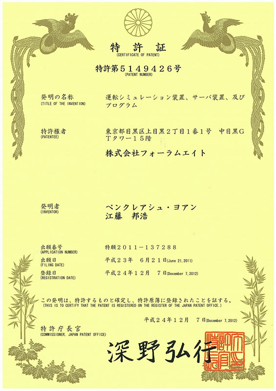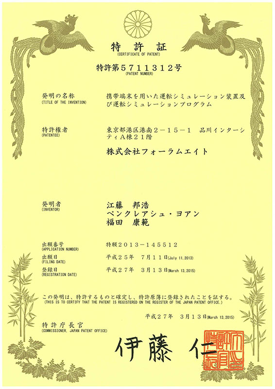 【プレスリリース】 「携帯端末を用いた運転シミュレーション装置及び同プログラム」の特許取得
