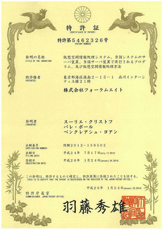 【プレスリリース】 仮想空間情報処理システムに関わる基本的な特許を取得