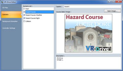 UC-win/RoadのRDデータをVR-Driveで使用するにはコース設定を行う必要があります。この操作はUC-win/RoadとVR-Driveプラグインで行います。UC-win/Roadのメインメニューから「VR-Drive」を選択するとVR-Drive Editorが表示されます。左の「Scenario」ボタンをクリックすると定義済みのシナリオがリストアップされて、どのシナリオをVR-Driveで使用するかをチェックボックスで指定できます。チェックするとCaption、Course Select Image、Descriptionが入力できるようになります。