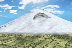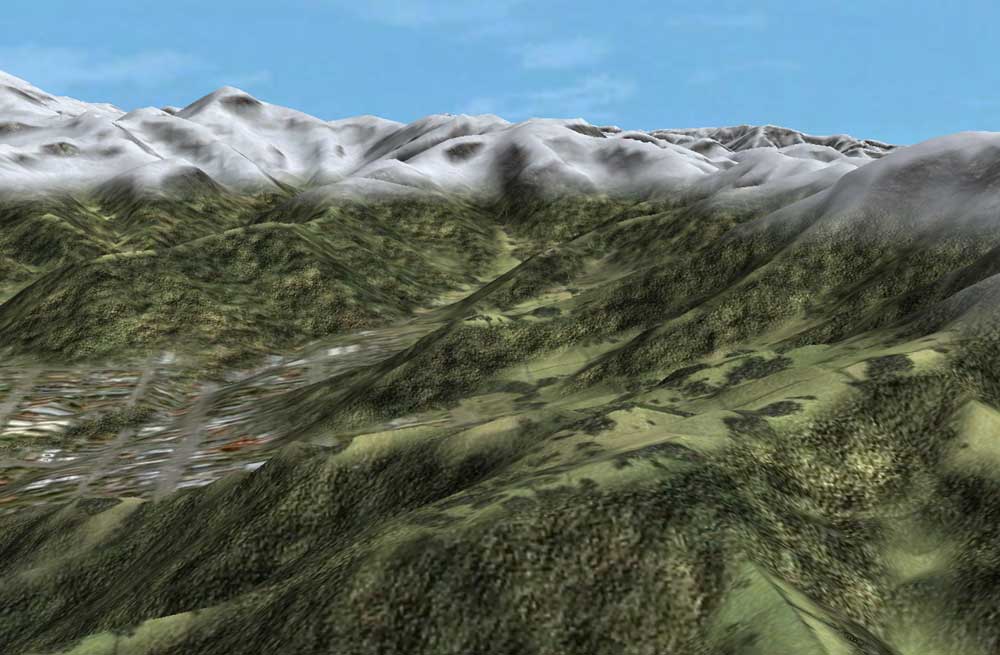 - 地形の標高と勾配から画像を選択し形状に合わせて変化させています。この機能によりDEMデータあるいはTINデータからリアルな地形表現が可能です。