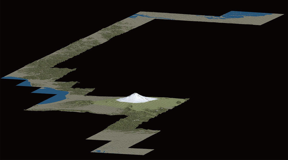 - 地形は、東京から富士山に至るおよそ100kmにわたる範囲を矩形ではなく、少しいびつな形で入力されています。道路は、高速道路をイメージした延長距離約70kmを入力しています。