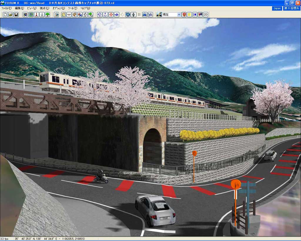 山梨県甲州市勝沼町のJR中央本線勝沼ぶどう郷駅前北区域公園の計画におけるVRシミュレーションモデル。甚六桜と旧ホーム跡を活かした公園づくりの中で県道上空を横断させるために架設する歩道橋の架設計画も行った。