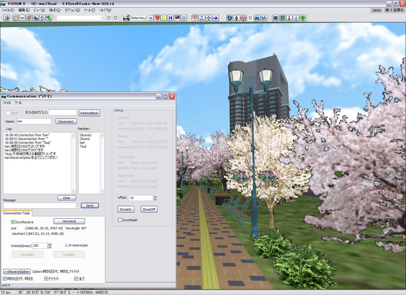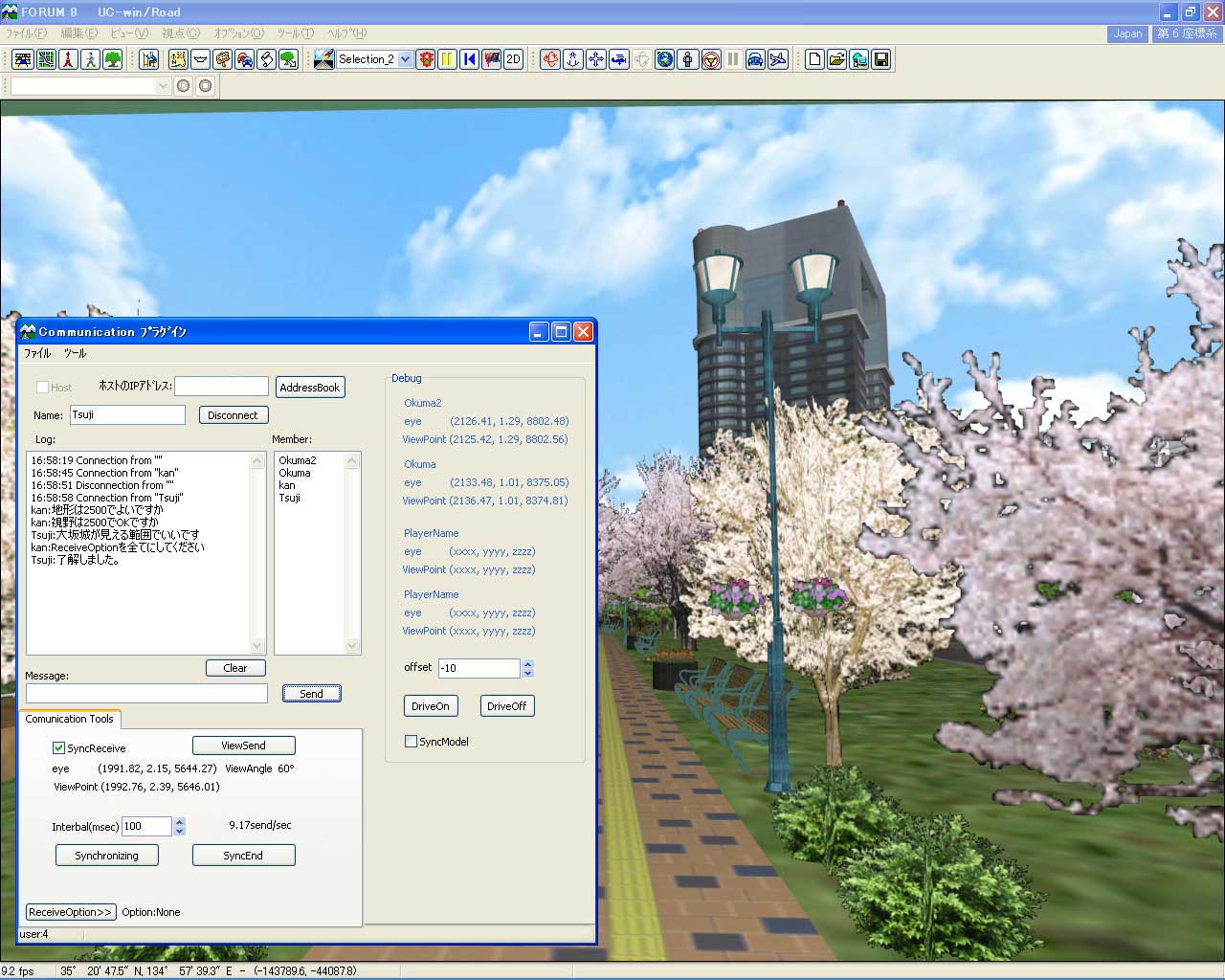 UC-win/Roadの制御情報の送受信機能を合わせて使うことによって、UC-win/Roadのデータを使った簡単な打ち合わせや会議等を行うことが可能となります。