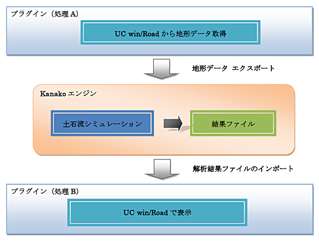 本製品は、京都大学大学院農学研究科で開発された『土石流シミュレータ(Kanako)』をソルバーとして、弊社にて別途、プリ部およびポスト部を用意し、一連の処理で土石流解析を行うことができる『UC-1 土石流シミュレーション』と、解析用インプットデータの作成および解析結果を可視化するための『UC-win/Road 土石流プラグイン』を統合したシステムです。システムの構成および流れについては、下図のようになります。