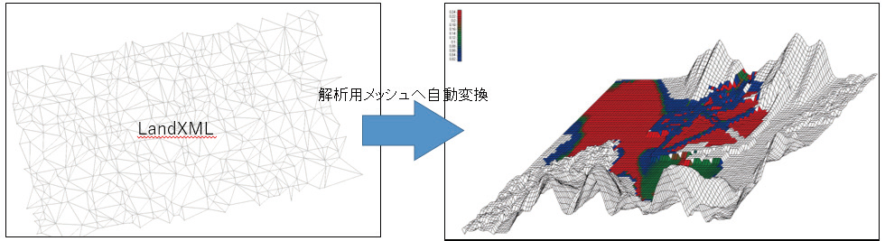 BIM/CIMにおいても利活用が推進されているLandXMLファイルのインポートに対応。これにより、各種の検討や設計の場面で多く利用されているLandXML形式の地形による土石流シミュレーションが可能です。