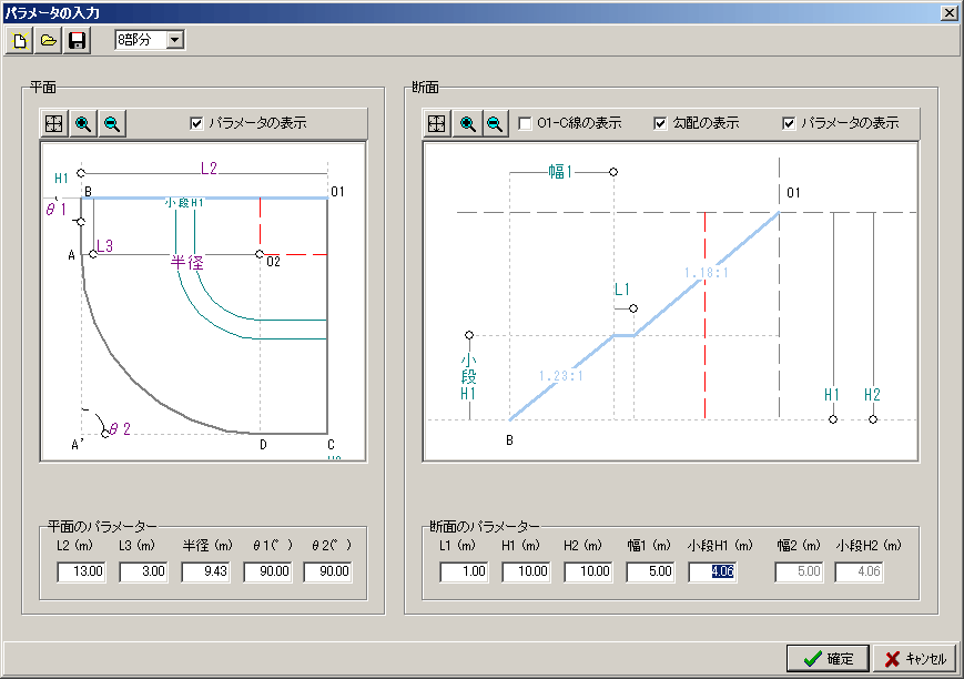 道路盛り土端は、勾配、小段の位置、交差道路の斜角などによって、複雑な形状をなす場合がありますが、本ツールでは、各寸法を定義することで、形状をイメージしながら容易に盛り土端モデルを作成できます。