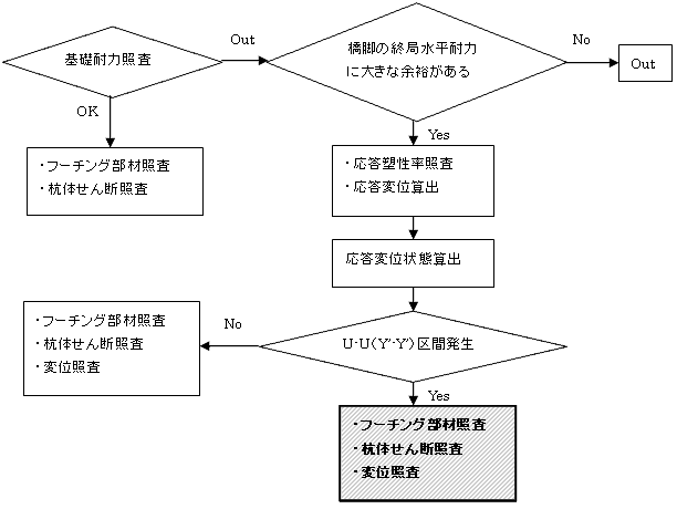 橋脚および橋台基礎の変形による上部構造慣性力作用位置における応答変位δFr,δArとなる状態までに、U-U(Y'-Y')区間が発生したとき、δFr,δArとなる状態が正しく算出できていなかったため、以下のフローのハッチング箇所に影響があります。