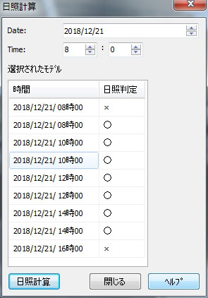 설정을 하고 있으며 일시를 지정하는 것에서 곧바로 분석 결과를 볼 수 있습니다.또 일조 계산에 따른 주변의 고층 빌딩에 영향을