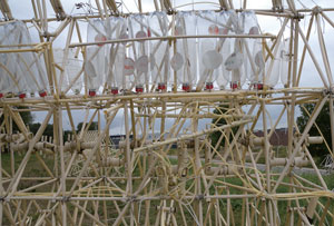 オランダ人芸術家テオ・ヤンセンのStrandbeestと呼ばれる風力で無人歩行する塩化樹脂パイプで組上げられた、各種様々な形態のビースト達は柵も何もない無防備な場所に雑然と置かれており、コンテナを使って作られたアトリエも自由に見学でき、これが世界的著名なアーティストの製作現場かと愕然としたが、彼の素朴で飾らない孤高な性格が垣間見れる。天日に晒されて変色した塩化パイプは本物の白骨の様で思いの外リアルで生々しい印象だった。