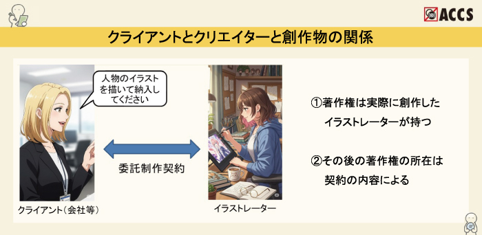 著作権の基本として、イラストの著作権は、そのイラストを創作した人や会社に与えられます。したがって、たとえお金を支払ってイラストを発注したとしても、制作者が著作者として著作権を保有したままであり、自由に利用することはできません。