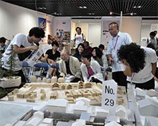 午後の審査会では第2次審査として33作品を13作品にしぼって第2次審査通過作品とし、第3次審査ではそれらの作品の模型を中央テーブルに集め、出展者のプレゼンと質疑応答による議論がおこなわれました。最終審査は委員による投票と議論によって、金賞銀賞各1点、銅賞2点、審査委員特別賞計5点が選出されました。会場へは見学者も大変多く訪れ、活発な議論に熱心にききいっている様子がみられました。
