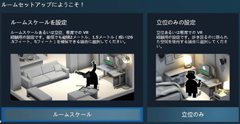 「ルームセットアップにようこそ!」と表示されるので、メニューから「ルームスケール」を選択します。画面の指示通りにモニターと床の位置を定めていきます。