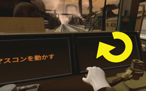 次に画面左側のマスコンハンドルの上に『左手』を乗せて左手に持ったコントローラーのトリガーを引くと、ハンドルを掴むことができるので、時計回りに回すと走行開始です。