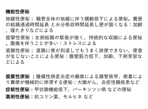 慢性便秘の人では、健康な人に比べ腸内細菌の乱れ、明らかに逸脱して腸内細菌の構成が異なった状態(dysbiosis)が報告されています。炎症や感染、食事などの様々な原因でその状態になっていることが考えられています。そのため慢性便秘の治療として、腸内細菌叢の乱れを改善させることが重要だとされています。この目的で、腸内細菌をターゲットとしたプロバイオティクスとプレバイオティクスがあります。プロバイオティクスとは「腸内細菌のバランスを改善することにより、宿主に有益な効果をもたらす生きた微生物」でヨーグルト、乳酸飲料などの食品やサプリメントととして摂取することが可能です。プレバイオティクスは「限られた数の腸内細菌の増殖または活性を選択的に刺激することによって宿主に有益な生理学的な効果をもたらす非消化性物質」で、食物繊維やオリゴ糖など善玉菌のビフィズス菌の増殖促進に働くものです。