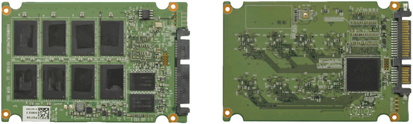 SSDは2.5インチパッケージが一般的で、その内部は基板上に以下4つの部品が乗っている単純なものです(図2)。