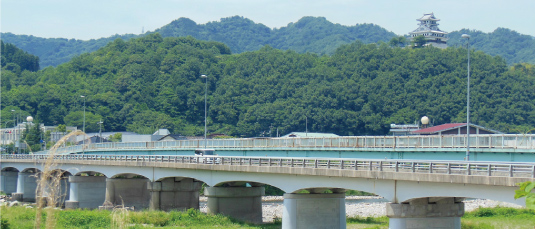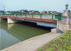 古来は両岸に大縄を張りそれを手操り、渡し舟で行き来していた様だ。緩やかな曲線を連ねるグレー色の桁が伸びやかな印象を与え、背後に控える河原城と良く調和し、橋脚と桁との支承部がアクセントになっている。現在は東西両端部の拡張に伴い親柱は撤去され、高欄は強固なものに替わったが当初のままの姿をほぼ残している。
