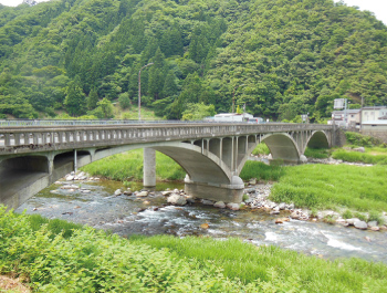 2004年『土木学会選奨土木遺産』に選ばれた八東川に架かる橋である。構造は、先に着工し竣工していた伯耆町長山の登山橋と同型といわれこの橋を参考にしたと思われる。当時の橋梁で3連という規模のアーチ橋は非常に珍しい。現在は両高欄の外側にアルミパイプが添架され、上流側に歩道橋が架かっているために下流側からしか望めないが、それ以外は当初の姿を残している。