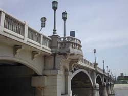 昭和2年に架橋され全長262.5m、幅員20mの橋で当時は、中央に電車軌道が設けられていた。上部工は鉄筋コンクリート形式で、低水敷にはスパン20.1mのアーチ6連を架け、高水敷には外観がアーチ風の連続桁(右岸3連、左岸6連)が用いられた。橋脚は河川の流水を阻害しないように小判型に仕上げられているため、少し末広がりになり安定感がある。橋台の側面には2本の付け柱が立ち、橋脚の上に4ヵ所大きなバルコニーがある。高欄は御影石製、バルコニー部には擬石柱が立てられ、照明灯はクラシックな六角形の灯具が使われている。平成5年、アーチ、バルコニー、照明、高欄を修復以降、夏期は涼しげな白い水銀灯、冬期はオレンジ色のハロゲンランプでライトアップされる。
