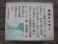 橋長57mの水路橋で石造りの橋。架橋は明治24年、疎水開通時のもの。老朽化に伴い昭和26年に旧橋に隣接してコンクリート橋が新設された。内部には3代目となる直径約80cmの樹脂管が通っている。現在は、生活道路橋として使用されている。上流側は重量感のある石造り、下流側は立体的なデザインの鉄筋コンクリート造りで連続アーチをなす。疎水の設計には、日本の近代水道整備に貢献した英国人技師、パーマーが携わった。志染川の流れる谷筋は集落を挟み幅が約736mあり、そこに管を通し水を渡すため液体を高所から低所へ移すサイホンの原理が応用された。サイホンを含め、総延長26kmの大事業であった。