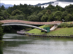 ハイウェイオアシス・総合公園亀山サンシャインパーク高塚池に架かる歩行者専用の橋です。吊床版橋と偏平アーチ橋の複合構造で、アーチ部と両端の斜材が吊床版にかかる水平力を相殺することで、通常吊床版橋に必要なアンカレイジが不要となり、簡素化した構造となっています。建設中の仮称ときめき橋で、2002年度土木学会田中賞を受賞しました。