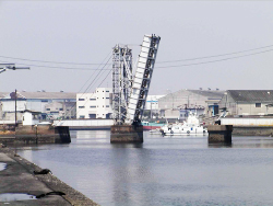 四日市港に大きな存在感を持つ橋です。歴史も古く、昭和6年に架設されて現在は3代目が活躍しています。もともとの入り江を利用して作られた港で発展するにつれ港が狭くなっていったため、この橋が必要となり建造されました。