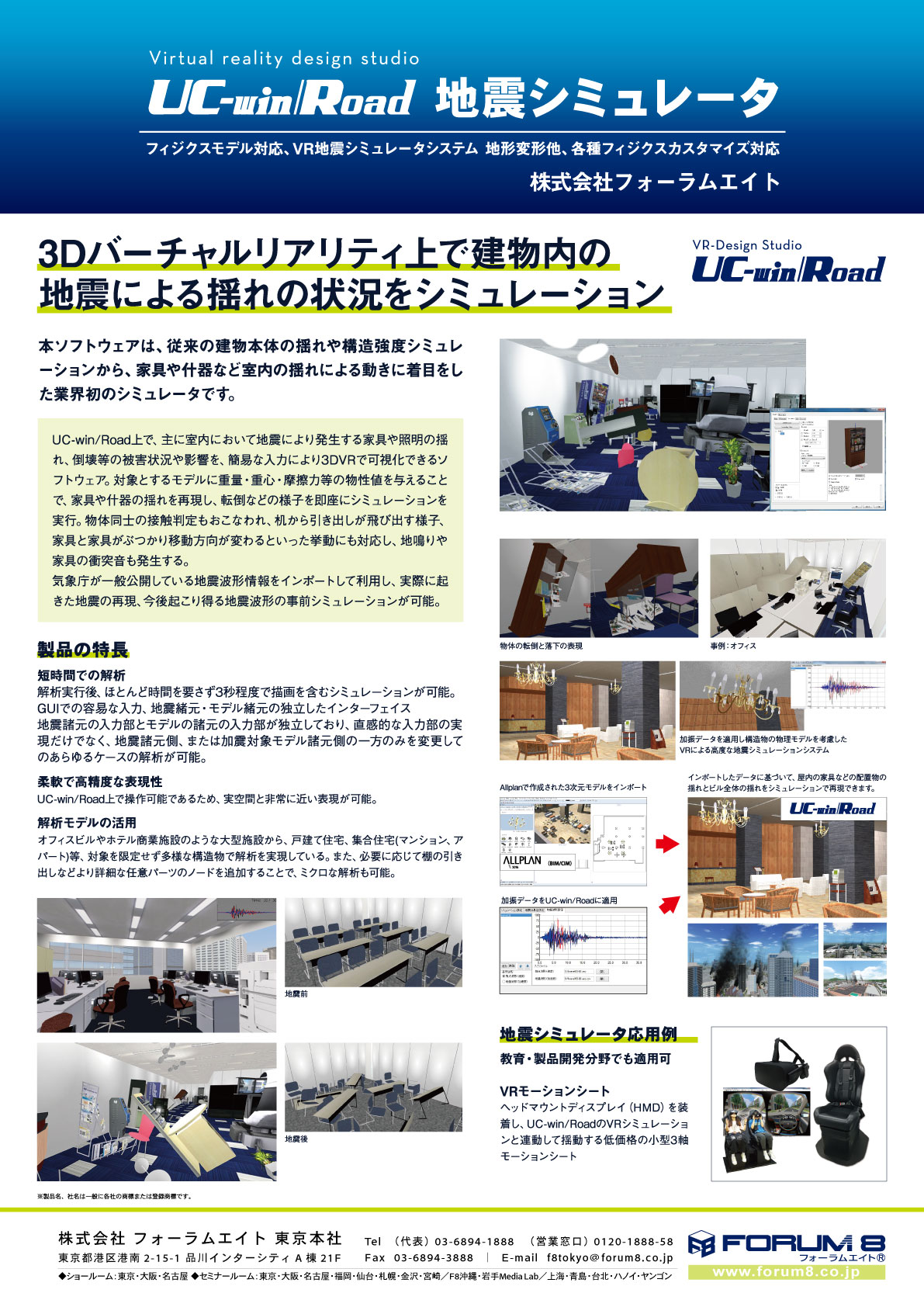 今回ソフトウェア部門にて優良賞を受賞した「UC-win/Road地震シミュレータ」は、建物本体の揺れや構造強度シミュレーションに加えて、室内の揺れによる家具や什器などの挙動に着目した業界初の製品です。3次元バーチャルリアリティソフトウェアUC-win/Road上で、家具や照明の揺れ、倒壊等の被害状況や影響を、簡易な入力により3DVRで可視化できます。