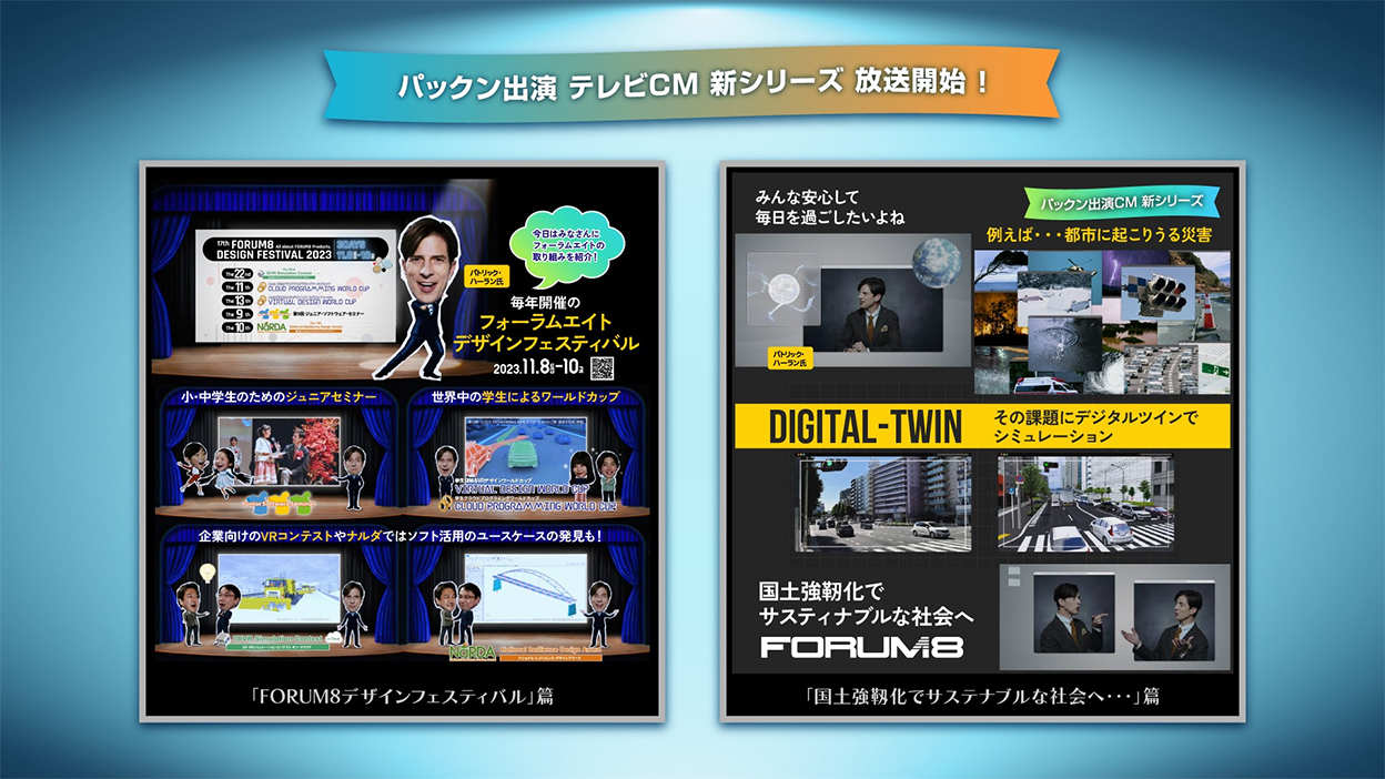 フォーラムエイトは、2023年6月より、パックン(パトリック・ハーラン氏)出演の新テレビCMを各局で放映開始いたしました。