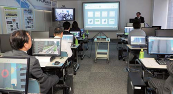 セミナー会場では、受講者一人ひとりに対して一つのテーブルが与えられ、その上にはモニター、キーボード、マウスが2台ずつ載っています。左側のモニターやキーボードなどはWindowsで動作するワークステーションに接続され、UC-win/Roadがインストールされています。