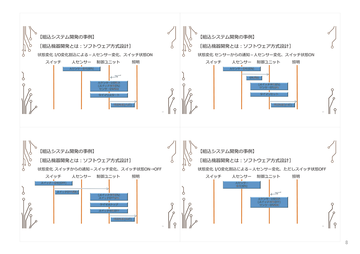 このほか、時刻データを誤って読み出すエラーや計測値をサンプリングする周期や境界値の設定、センサーの劣化による感度やゼロ点の変化に対する更生、音声波形の非連続による大きな雑音発生など、リアルな現象や機器を扱うシステムならではの注意点を説明しました。