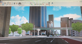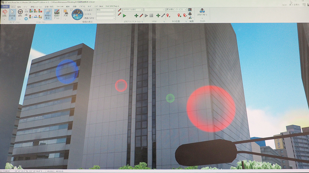 ラズベリー・パイ側にUC-win/Roadからの位置座標がちゃんと伝わり、Pythonプログラムが機能しているのかを確かめるため、プログラムを起動させ、UC-win/Road上でドライビングシミュレーターを運転してみます。見覚えのある大阪支社のビルに向かって走っていくと、突然、ラズベリー・パイ上のLEDが点灯しました。