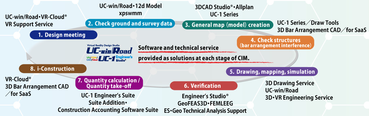 Efforts to Strengthen the National Land At Forum8's annual event "Design Festival" held in 2020, Mr. Yasushi Yamamoto, Counselor, Office for Promotion of National Land Resilience, Cabinet Secretariat, gave a lecture titled "Recent Efforts for National Land Resilience". In this seminar, he introduced the contents of the lecture and explained the efforts and effects of national land strengthening in Japan in an easy-to-understand talk. The 1959 Ise Bay typhoon, which caused the largest number of deaths and missing persons since the Meiji era (1868-1912), became the starting point for disaster prevention measures and triggered the enactment of the Basic Act on Disaster Management. The Great Hanshin-Awaji Earthquake of 1995 caused a massive fire that spread through the city and collapsed an elevated highway bridge, resulting in a great deal of human and material damage. The lessons learned from this disaster have led to the strengthening of earthquake resistance of infrastructure and the recognition of the importance of "self-help" and "mutual-help", and the concept of "disaster mitigation" was firmly established. In fact, when Typhoon No. 21 hit Osaka Bay in September 2008, the tide level was 36 centimeters higher than the previous highest tide level of the second Muroto typhoon in 1961, but the area of inundation, which had previously been about 3,100 hectares, was reduced to zero. While the cost of maintenance of beaches and river levees was about 130 billion yen, and the cost of maintenance and management after 1965 was about 20 billion yen, the damage if storm surge countermeasures were not implemented is expected to be about 17 trillion yen. From these figures, we can see that the cost effectiveness of national land fortification is high. Resilience Design Awards Forum8 has been an early provider of solutions for national infrastructure enhancement, ranging from planning and design using BIM (Building Information Modeling) and CIM (Construction Information Modeling) to strengthen social infrastructure, to analysis, simulation, and visualization of damage using VR (Virtual Reality). Our solutions range from planning and design using BIM (Building Information Modeling) and CIM (Construction Information Modeling) to strengthen social infrastructure, to analysis, simulation, and visualization of damage using VR (Virtual Reality), as well as "i-Construction" promoted by the Ministry of Land, Infrastructure, Transport and Tourism. Forum8 has been holding a contest called the National Resilience Design Award (NaRDA) since 2014 to support engineers who are working on national resilience. Forum8's BIM/CIM, VR, analysis, simulation software, and cloud computing are used to evaluate the earthquake resistance of social infrastructure, reinforce it, and simulate damage. Product Overview and Features "National Land Resilience" is an initiative to prepare for natural disasters in advance and minimize the damage. As part of its "IM&VR/ National Land Resilience Solutions," Forum8 offers the real-time VR system "UC-win/Road," the design and analysis solution "UC-1 Engineer's Studio," and the BIM/CIM software "Allplan series, etc., according to the phase of the project. The phases are (1) design discussion, (2) geotechnical and survey data confirmation, (3) general drawing (model) creation, (4) structural check (reinforcement interference), (5) drawing, diagramming and simulation, (6) design verification, (7) quantity calculation, cost estimation and bidding, and (8) construction and i-Construction.
