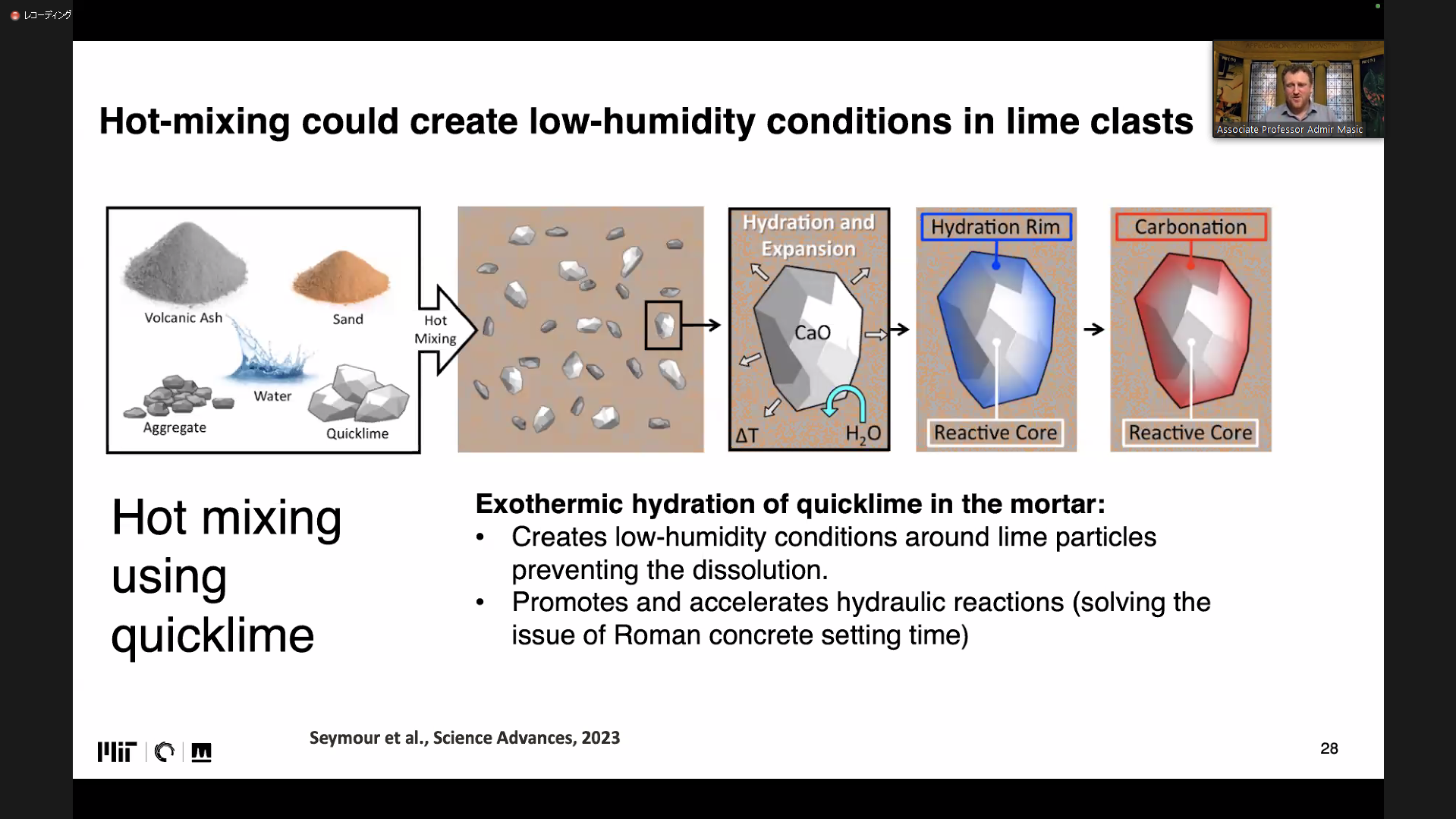 Masic氏は多機能セメント系材料の専門家であり、持続可能な未来に向けて「コンクリートの多機能化」の観点から社会課題を解決することを研究テーマとしています。今回の講演では、「CO2排出」「建築物の長寿命化」「再生可能エネルギー貯蔵」の3つの課題を題材にしてお話しいただきました。