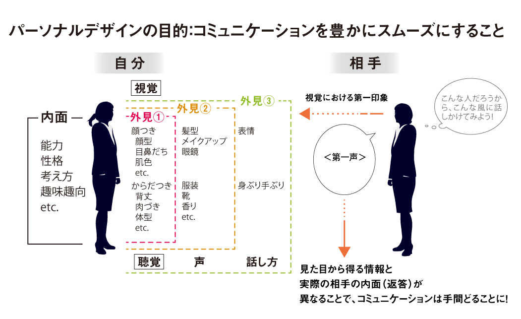 パーソナルデザインの目的は、コミュニケーションを豊かにスムーズに進めるためですから、まずは自分が何者であり、どんな人物なのかを第一印象でわかりやすく相手に伝えることが第一歩です(※図1)。高度経済成長時代のように集団に群れ、一働きバチとして目立たないように生きる時代ではありません。個性を活かすことこそ、パーソナルデザインの真骨頂です。個性とは、なにも飾り立てることではなく、地味なスタイルであっても独自の個性になれば良いのです。例えば、菅官房長官はとても地味なスタイルです。髪形を変えればこんな印象になるに違いないと想像している私ですが、あの方の個性を考えると、現職の間は今のままで良いでしょう。現に「令和おじさん」と呼ばれ、若い人たちに「かわいい」とまで言わしめる存在感は大したものです。
