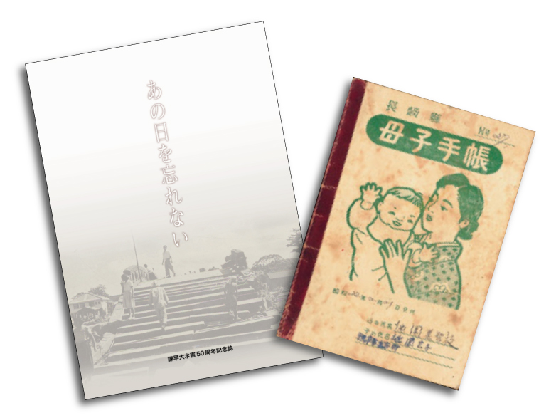 写真1 諫早大水害50週年記念誌(左)と被災者の母子手帳(右)