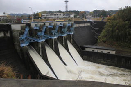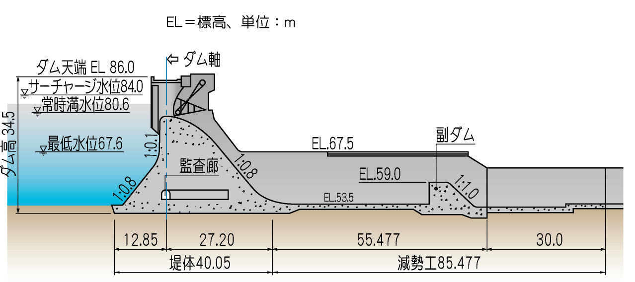 亀山ダムは、小櫃川の上流に位置する、堤高34.5メートルの重力式コンクリートダムです。千葉県内の多目的ダムとしては最初に建造され、昭和46年から昭和56年までの10年の歳月を費やして作られました。ダム湖の名称は亀山湖で、千葉県で最大の総貯水容量をもちます。 昭和40年頃まで、千葉県におけるコンクリートダムの建設は地質的な理由から困難と考えられていました。しかし、建設省土木研究所の指導のもとで行われた豊英ダム建設(昭和42~43年、最初のコンクリートダム)を通じて技術的課題が克服され、亀山ダム計画が実現しました。 亀山ダムの基礎地盤は、比較的新しい時代の砂岩と泥岩の互層で固結度の低い「軟岩」です。したがって、ダム本体の荷重を軽減するために、下流部勾配を緩くし、さらに前面にフィレットを付け底版幅を広くして安定を図りました(下図参照)。