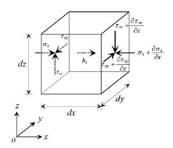 外力を受ける地盤内の応力状態は、直交座標系xyzで定義されている9つの応力成分(σx、σy、σz、τxy、τyx、τyz、τzy、τzx、τxz)によって表される。これらの応力成分の間の関係は、地盤内の1点の回りに微小直方体(図1)を考え、この微小直方体に作用するモーメントと力のつり合いを考えることによって求められる。