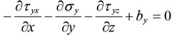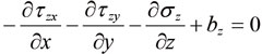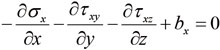 ここに、bxはx方向の体積力である。式(2)の両辺をdxdydzで割れば、式(3a)が得られる。