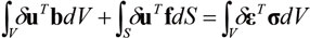 ここに、bは体積力、fは単位面積あたりの表面力であり、δεは仮想変位の各成分δu、δv、δwに対応するひずみ成分である。