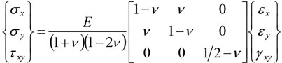 応力とひずみの関係式を数式で表すものを材料の構成則という。線形弾性材料の構成則はフックの法則と呼ばれる。これを次式に示す。