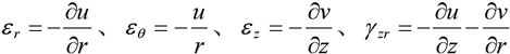 rおよびz方向の変位をそれぞれuおよびvとすれば、ひずみと変位の関係式は、次のようになる。