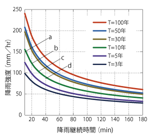 curve)として表される。都市流域の洪水リスク解析において、超過確率(再現期間)ごとに降雨強度の特性を表わした降雨強度曲線は、ハザード解析における降雨外力の基本となるものである。降雨強度曲線は、また都市河川の治水計画や下水道の雨水排水計画において用いられる合理式と直接結びついており、全国の各都市はそれぞれの降雨強度曲線をもっている。また、洪水リスクアセスメントにおいて、気候変動による洪水リスクの増加を議論するときも、私たちは降雨強度曲線が気候変動によってどのように変化するかを主要な論点とする。