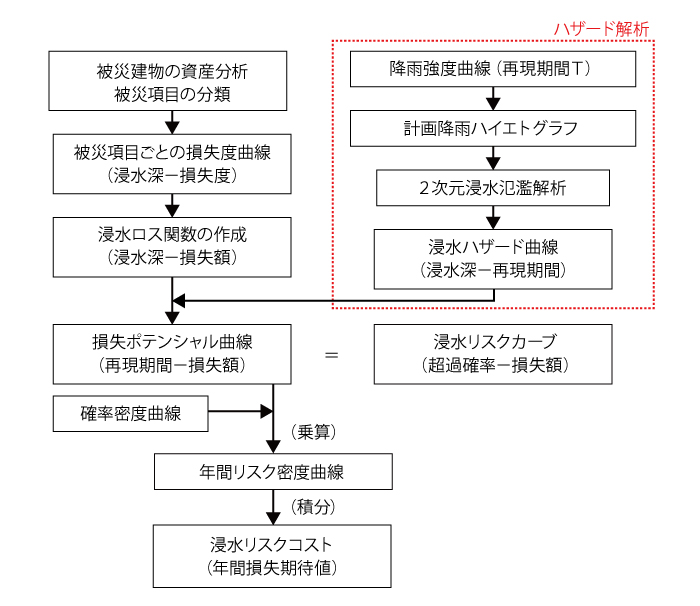 ミクロ解析とマクロ解析で対象は異なるが、洪水リスクを定量化する考え方は同じである。ここで、図11に洪水リスク定量化のマクロ解析のフローを示した。